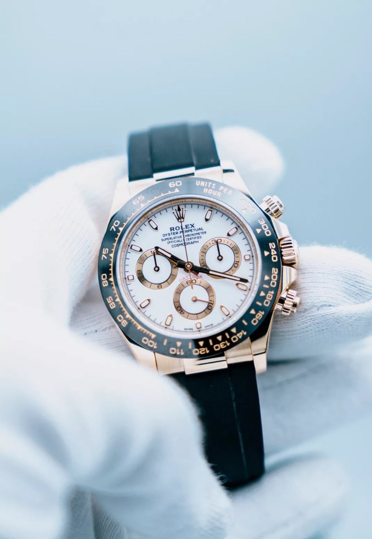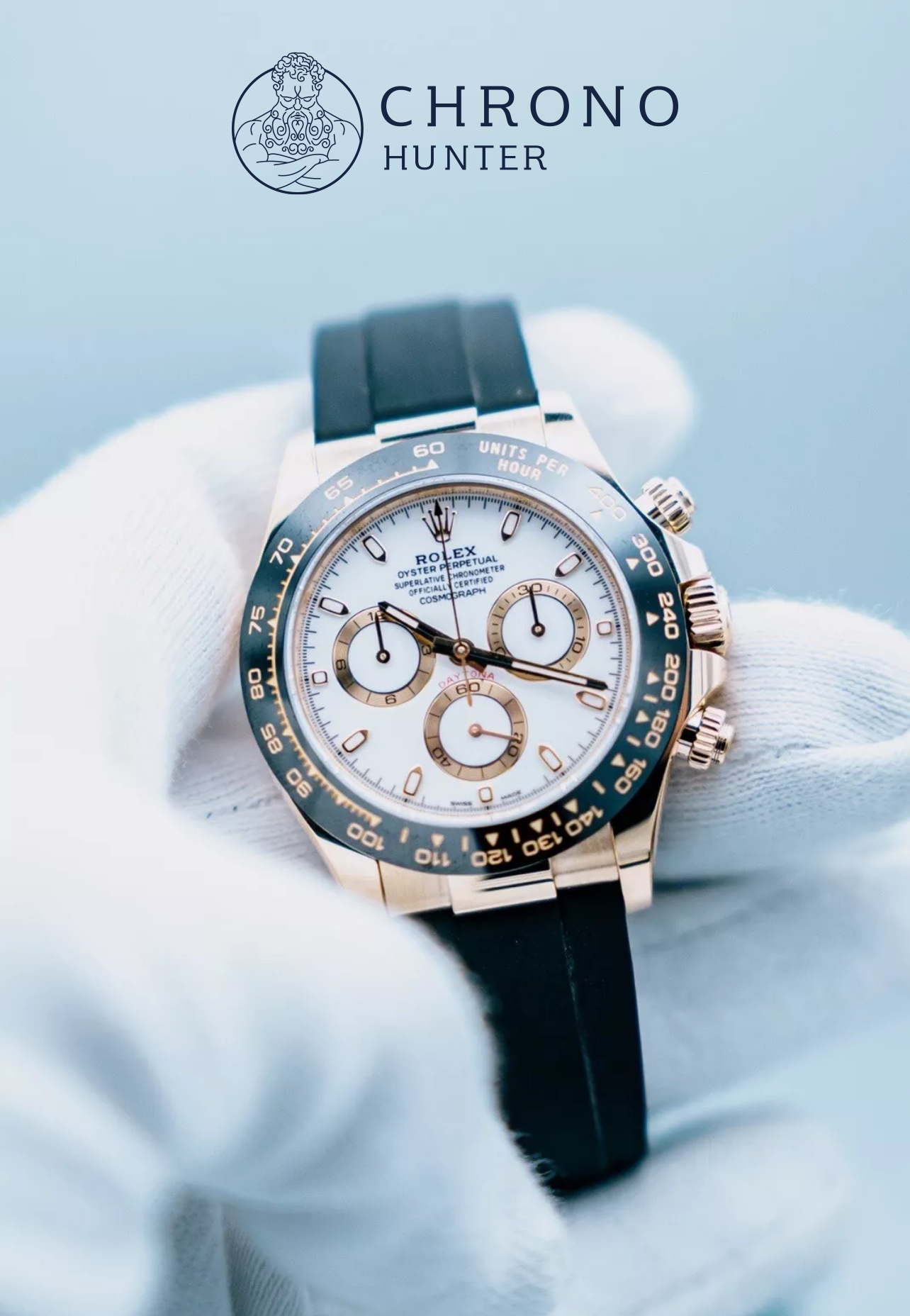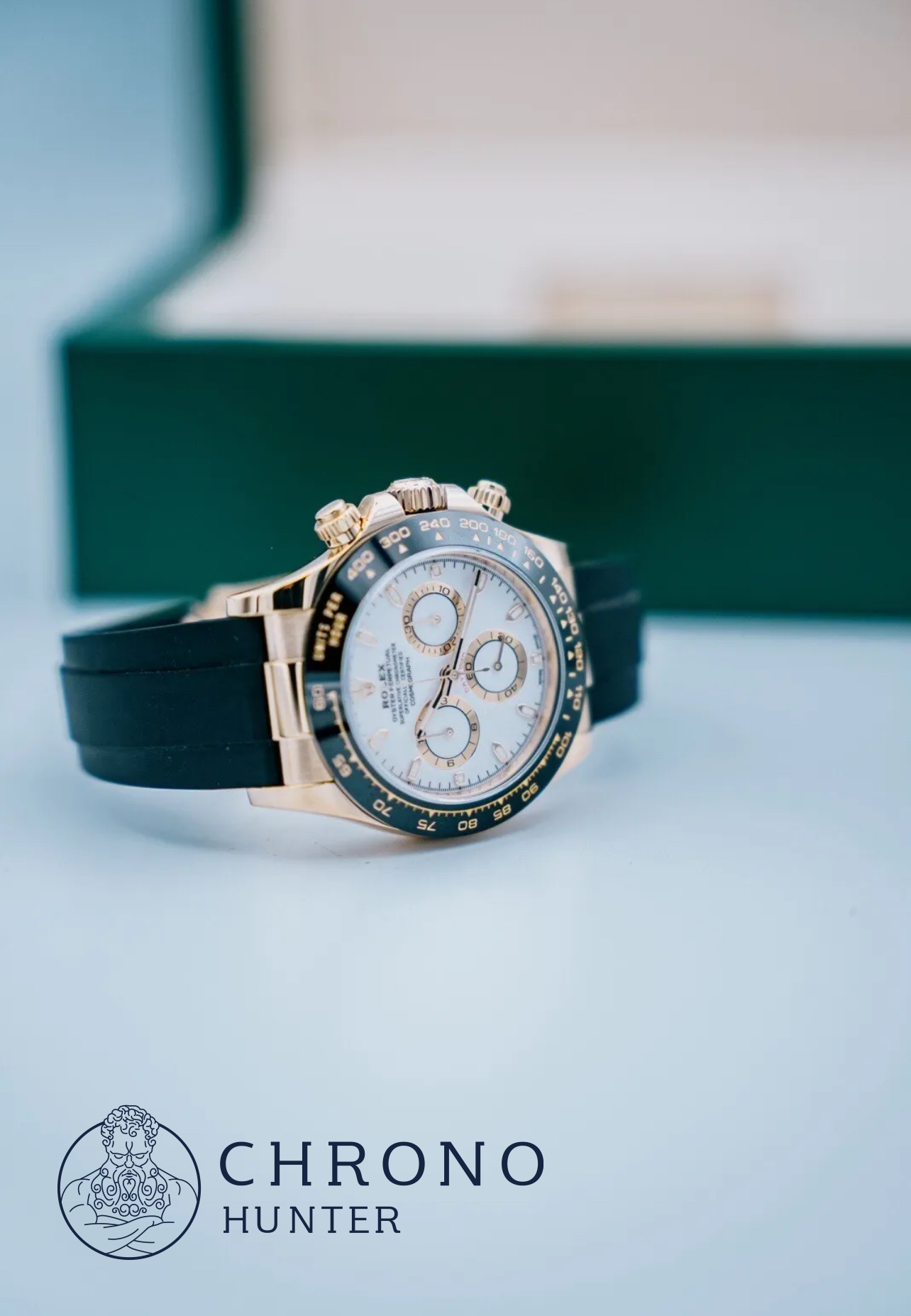 Elevate your style with the Rolex Daytona Reference 116518LN, crafted in 18k yellow gold and featuring a crisp white dial that pops against its black ceramic bezel. The sleek Oysterflex strap offers unparalleled comfort, combining sportiness with elegance.